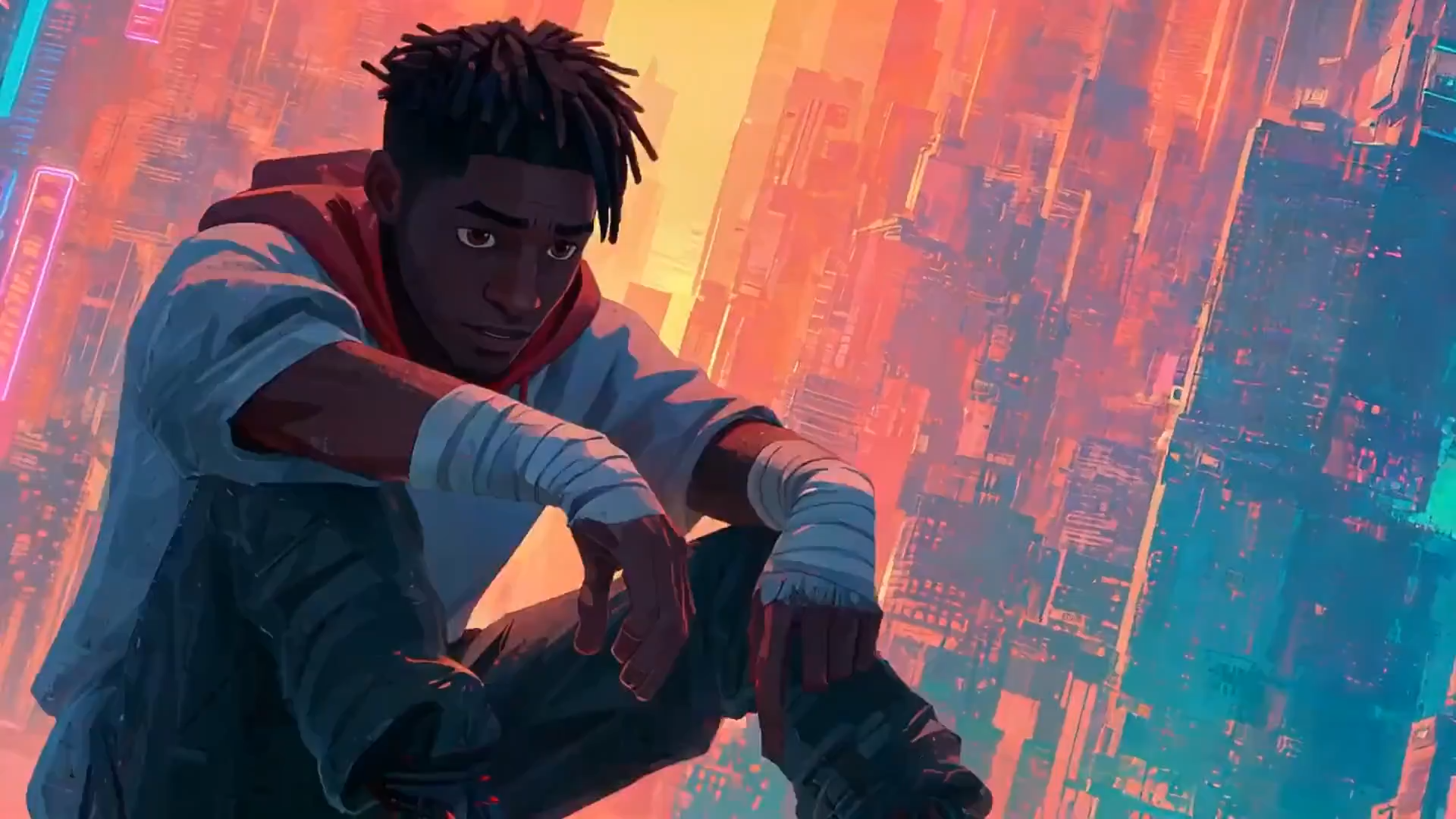 “@image1 @image2 @image3 @image4 @image5, one-take tracking shot, following a runner from street level up stairs, through corridor, onto rooftop, ending with city overlook.”